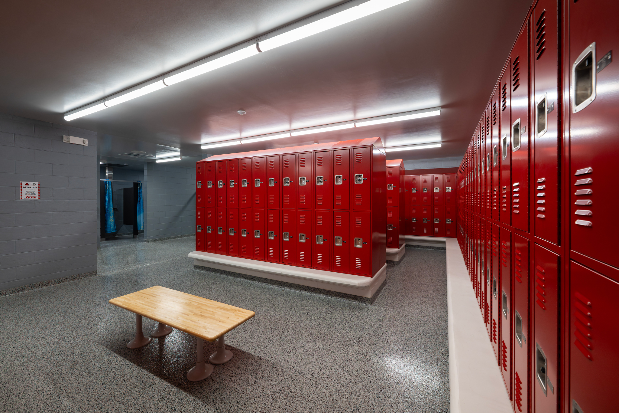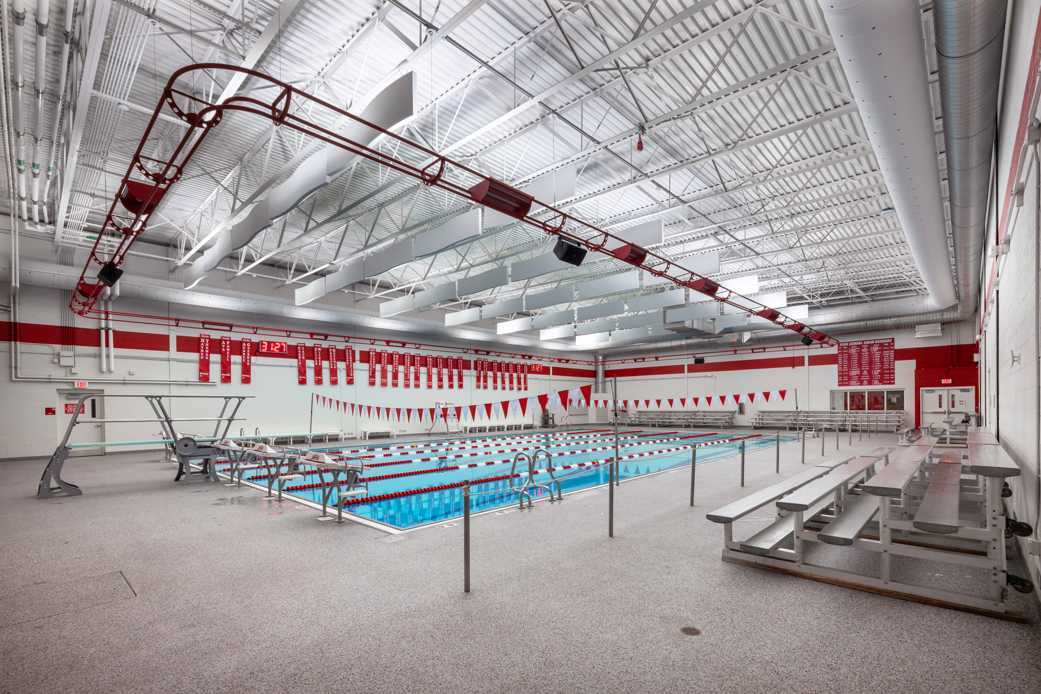 Working closely with the school’s athletic director and swim coach, the Elevatus design team listened to the needs of those who use the facility most. The result is a fully refreshed natatorium featuring upgraded lighting, a new dehumidification and HVAC system, a modern competition timing system, and a reliable chemical treatment system that ensures water quality. In the locker rooms, the renovation introduced new lockers, durable flooring, updated plumbing fixtures, and finishes that connect seamlessly with the pool space to create a unified experience.