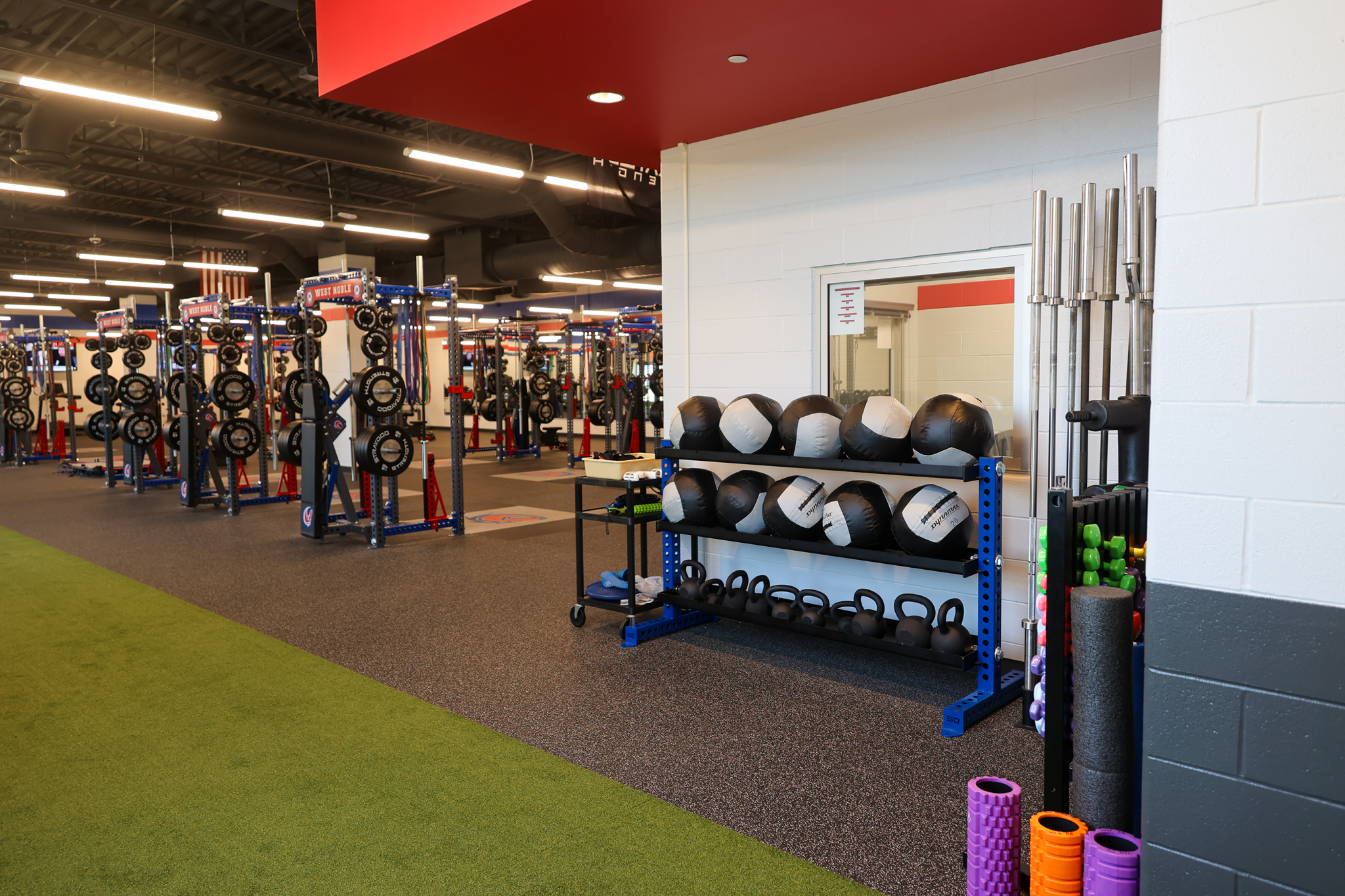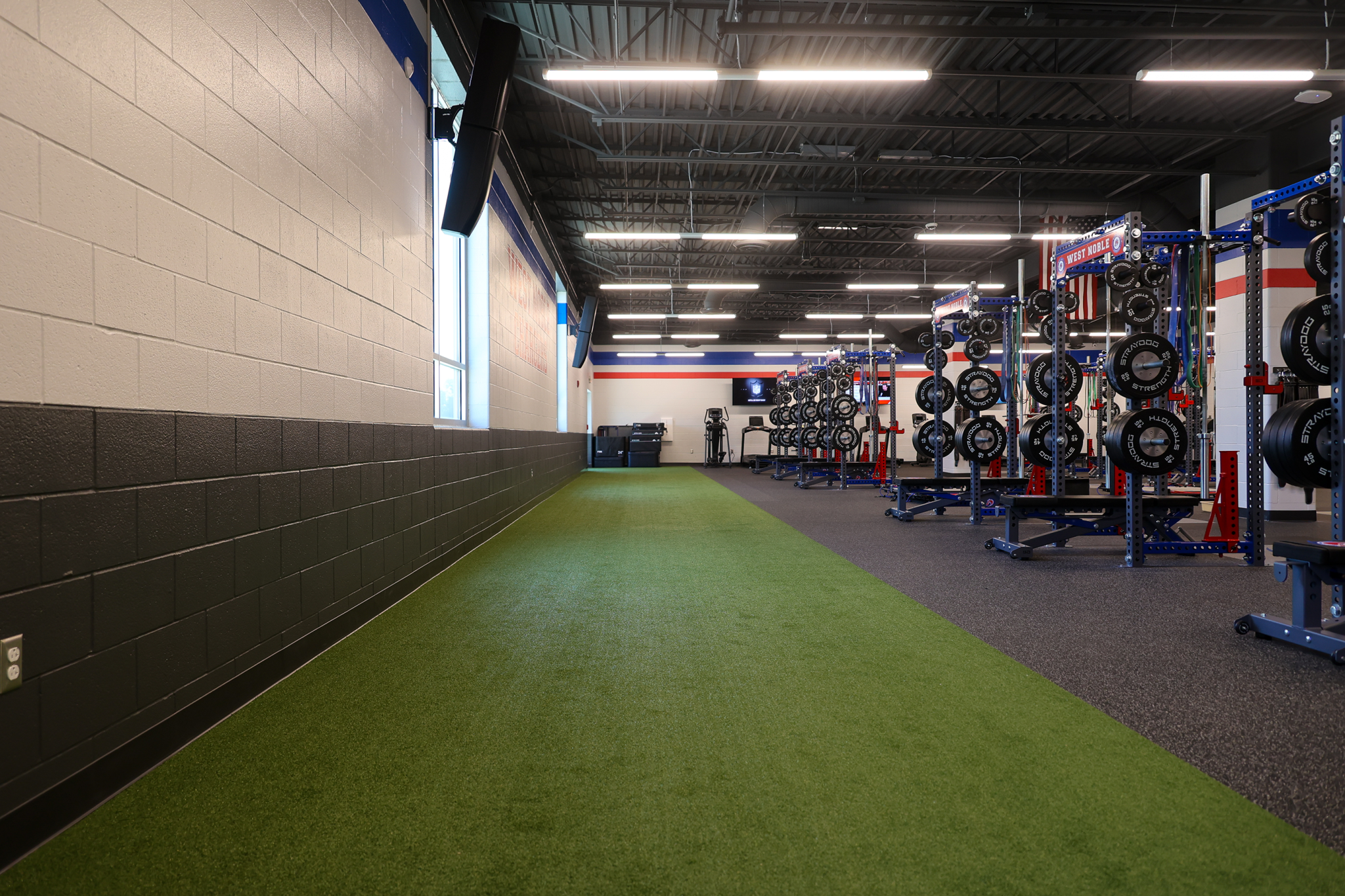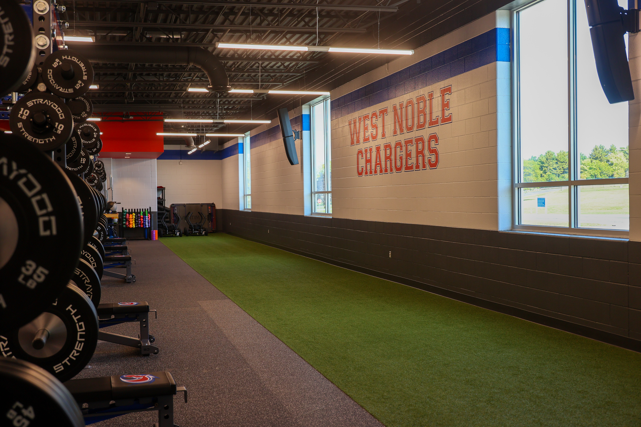 The previous weight room, previously located in two repurposed classrooms on the second floor, was inadequate for the district’s growing strength conditioning demands. To address this, the new 4,000 square foot weight room was constructed. This facility includes modern strength conditioning equipment, a synthetic turf area for agility and speed training, a coaches office, and a training room for injury rehabilitation. These additions enhance safety, supervision, and the overall effectiveness of the West Noble athletic programs.